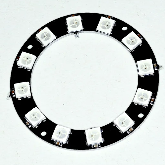 This WS2812B 12-Bit RGB LED Ring Module contains 12 individually-addressable RGB LEDs arranged in a circular PCB (approx. 50mm outer diameter). Each LED includes an integrated WS2812B driver IC, which means you can control every LED’s color and brightness independently using just one digital data pin.