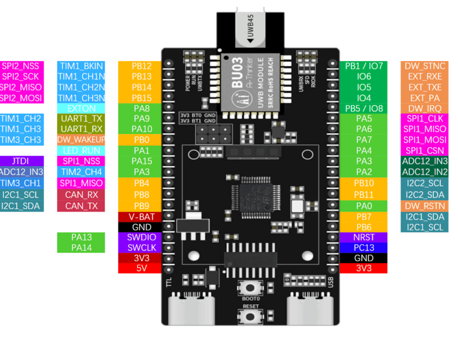 The BU03-Kit is a UWB development board based on the BU03 (DW3000) module and powered by an STM32F103C8T6 MCU. The BU03 module integrates an onboard antenna, RF circuitry, and power management.