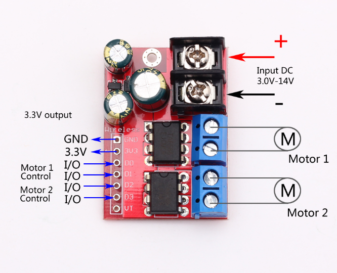Wide Voltage Range: Operates between 3V and 14V, suitable for various DC motor types.